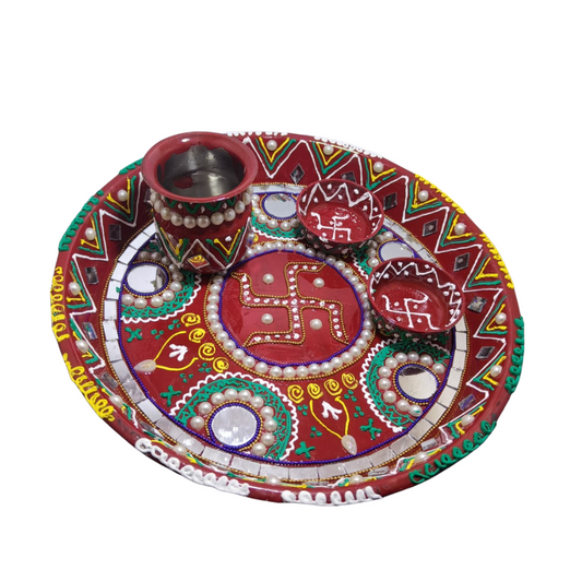 Mihikart Handmade Decorative Pooja Thali Swastik Design, Puja Plate, Karwachauth Thali Set, Diwali Gift Items, Decorative Items for Pooja, Aarti Thali Decorative - 11 inches